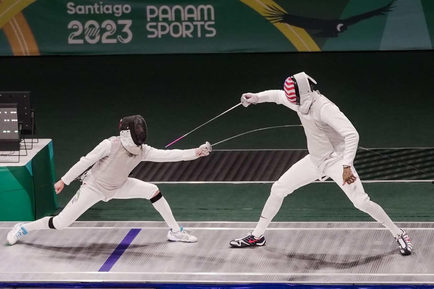 A pista de esgrima possui 14 metros de comprimento e dois metros de largura; os pontos são indicados por duas lâmpadas que existem no aparelho marcador de toques, uma verde e outra vermelha, acendendo sempre do lado do atleta que realizou o toque, fazendo com que este receba um ponto.